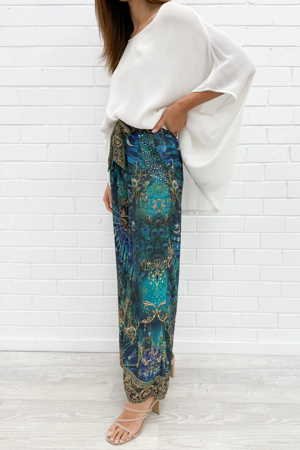 Beautiful print and colours. The waistband is elasticated, and there is a removable belt. The wide-leg shape drapes beautifully down the leg, and the material is flowy. There’s a matching shirt, so you can wear it as a set!