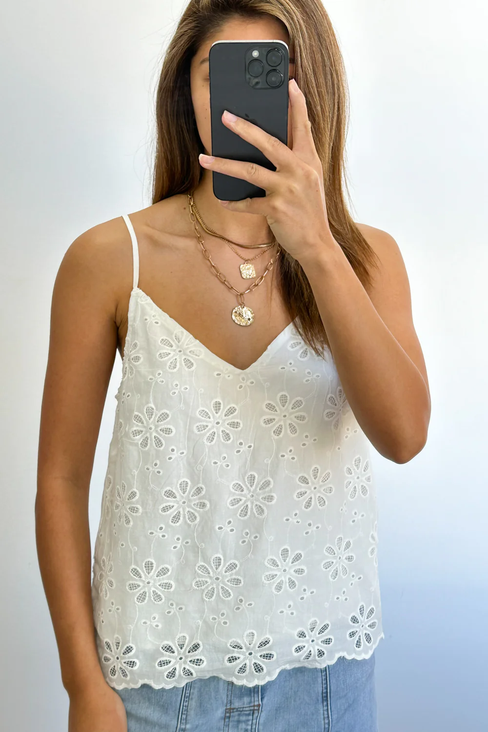 A lace kind of version of our Kellie Cami in white, which is just a really good basic. A good length, loose but not super baggy, has adjustable straps, and comes in fabulous colours – win!