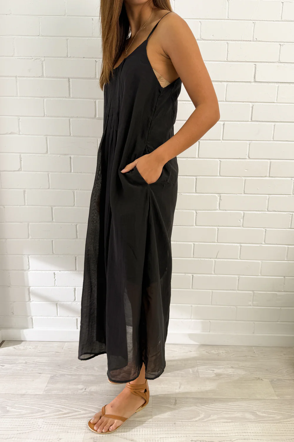 A simple, easy to throw on black midi dress. The fabric is nice, the straps are adjustable, the fit is good, and the pleats give it a little bit of a sophisticated look. Love.