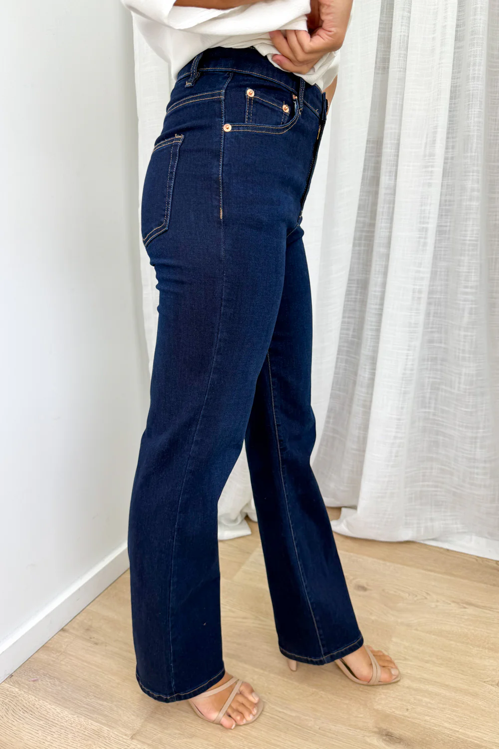 A straight leg and a good length - these sit just below my ankles, just above my foot. They aren’t super stretchy but they do have stretch, and all the pockets are functional. They sit on my belly button, and they’re kind of like a classic shape which you can wear day in and day out, for pretty much ever.