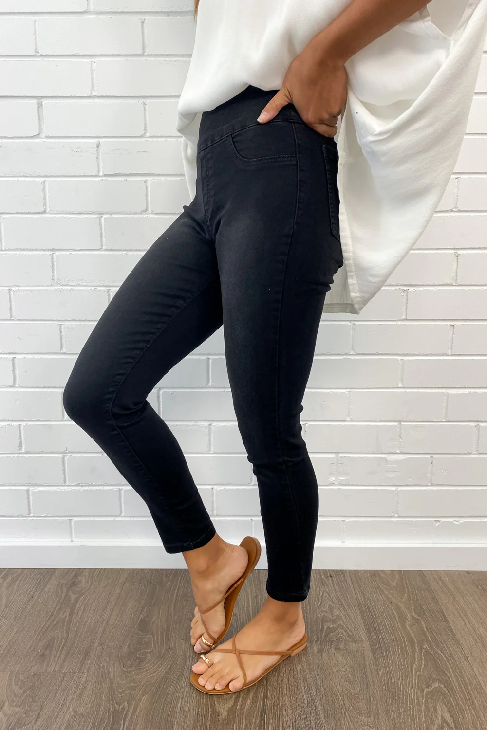Pretty much the same as our epic Panel Jeans, but without the panel on the knees and a tiny bit thinner. Super stretchy, a good length, and featuring the panel on the tummy - which I know I love. You'll like them.